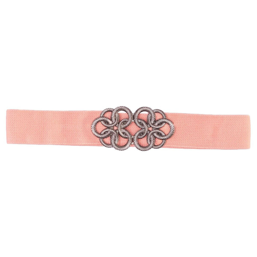 Женский ремень-резинка нежного розового цвета шириной 4см и длиной 105см с интересной темной металлической пряжкой прекрасно подойдет к объемным вязанным изделиям или верхней одежде.