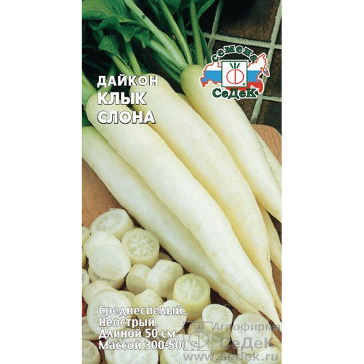 Среднеспелый (от полных всходов до хозяйственной годности 70-90 дней) сорт. Корнеплоды удлинен-но-цилиндрические, белые, у головки светло-зеленые, длиной до 50 см, массой 300-500 г. Мякоть белая, сочная, без острого редечного вкуса. Корнеплод на 2/3 погружен в почву и легко выдергивается при уборке. Урожайность 3,2-4 кг/м2. Ценность сорта: холодостойкость, обладает высокими вкусовыми и диетическими свойствами, содержит соли калия, кальция, клетчатки, пектиновые вещества. Широко используется для профилактики диабета и при облучении. В пищу употребляется в свежем, вареном и соленом виде.