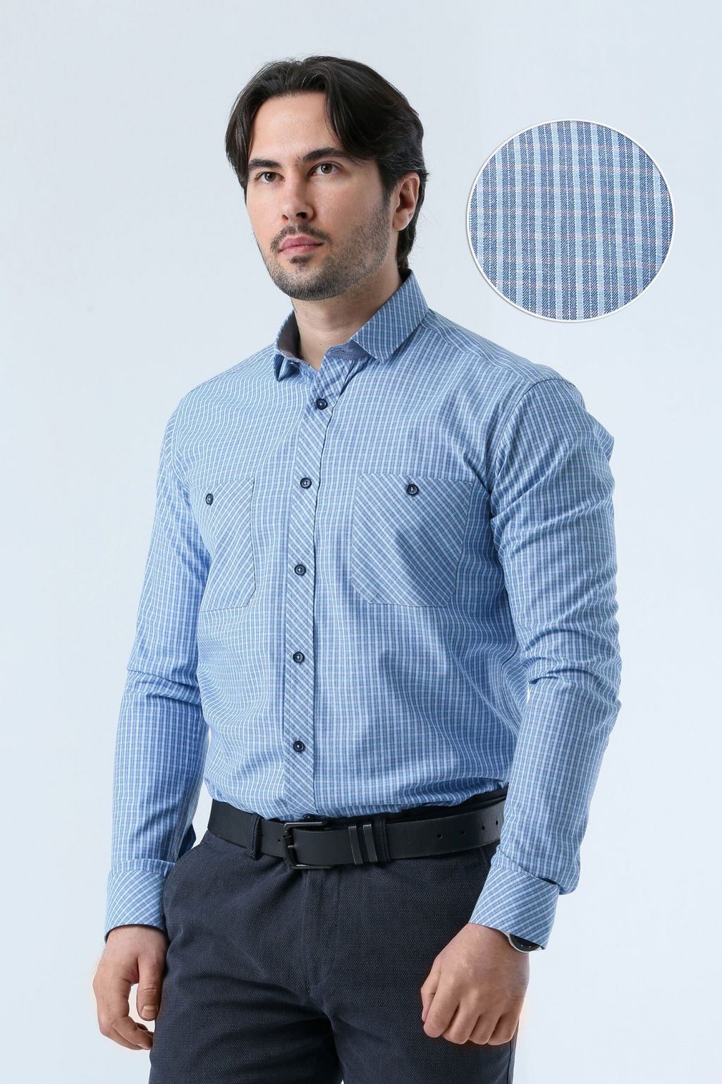 Рубашка прямого кроя в стиле кэжуал голубого цвета в клетку с длинным рукавом. 2 кармана на пуговицах.