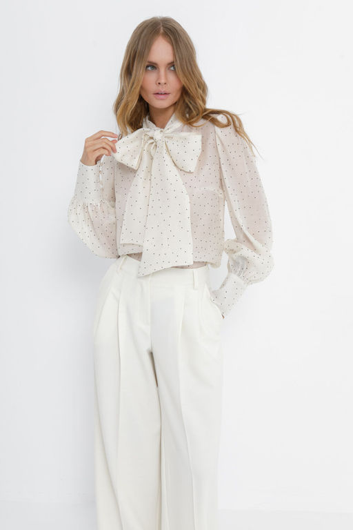 Блуза с воротником-бантом из полупрозрачной вискозы с флоковыми горошками.