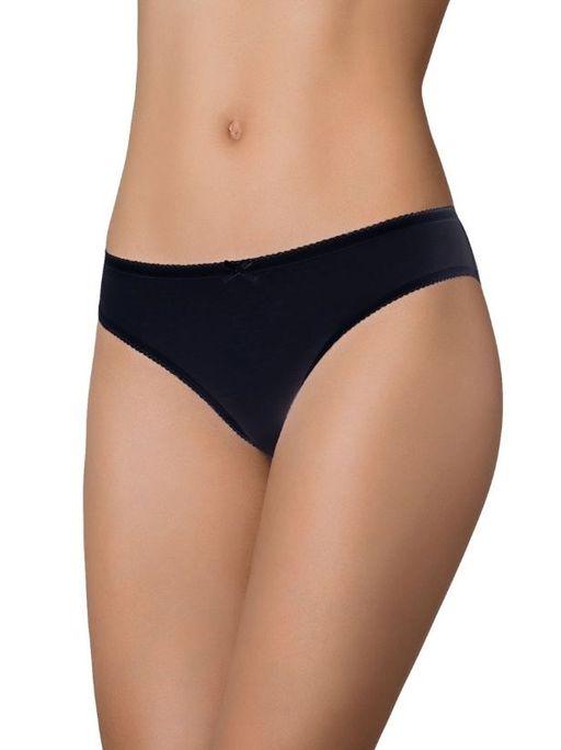 Женские хлопковые трусики слип Миними 221 из мягкого однородного трикотажного полотна с классической средней линией талии и стандартного размера бочком, обрамленные по контуру элегантной кружевной тесьмой, аккуратным бантиком спереди в качестве украшения и хлопковой гигиенической ластовицей.