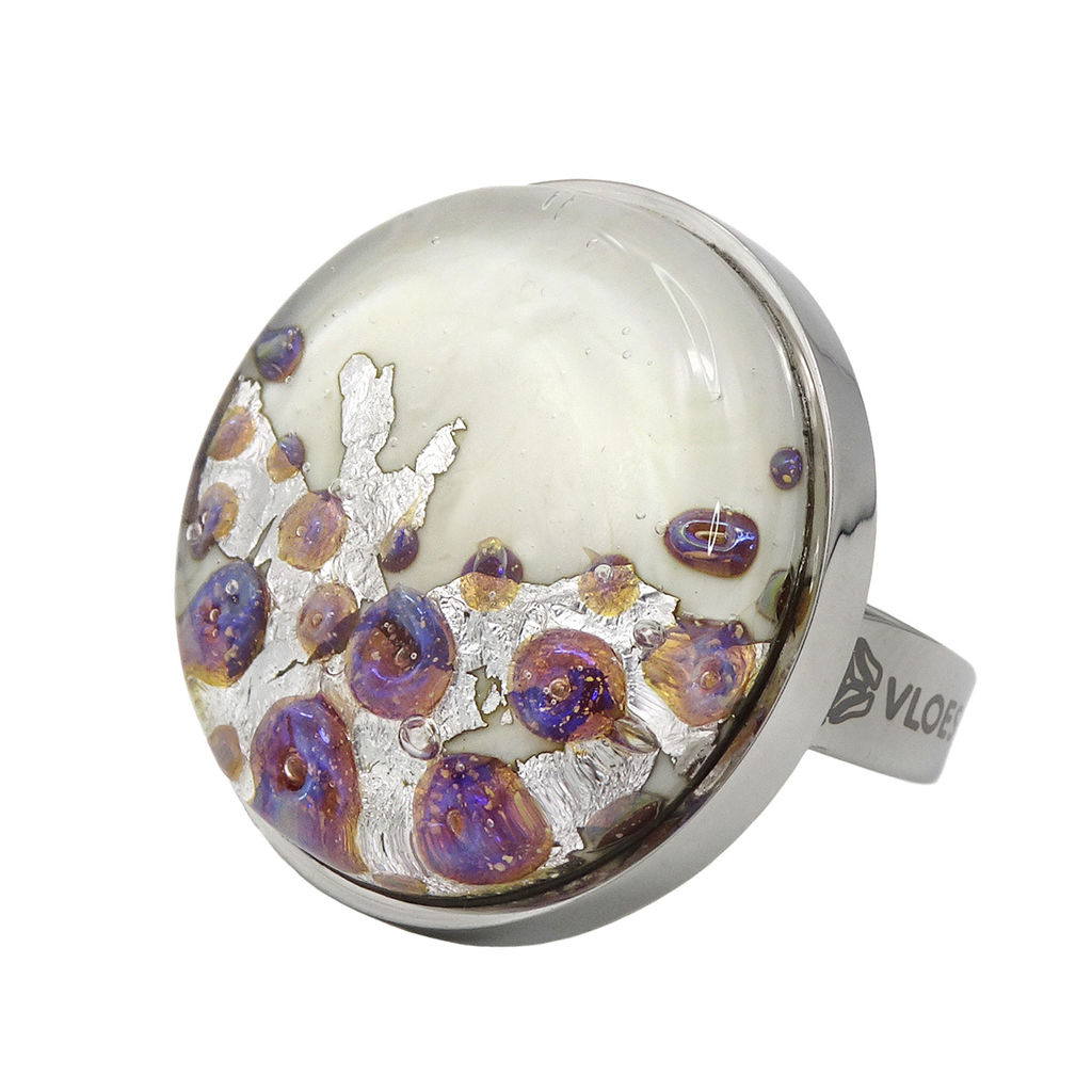 Кольцо изготовлено из муранского стекла и гипоаллергенной ювелирной стали, что очень важно для людей с чувствительной кожей. Металл не темнеет и не подвергается воздействиям окружающей среды, надолго обеспечивая красивый внешний вид изделия. Диаметр стеклянного элемента - 2.5 см. Кольцо безразмерное, регулируется с 16 до 19 размера. Вес - 12 гр.