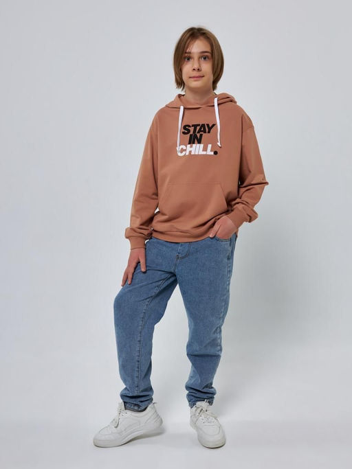 Толстовка с капюшон и карманом кенгуру. Вырез горловины V-образный, неглубокий. Капюшон с завязками, рукава длинные с манжетами. Декорировано изделие принтом. Тип ткани-Футер 2-х нитка.­