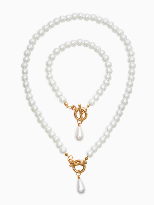 Набор 2 пред-та: бусы.браслет "Жемчуг", капелька, цвет белый в золоте L=18/42см №8