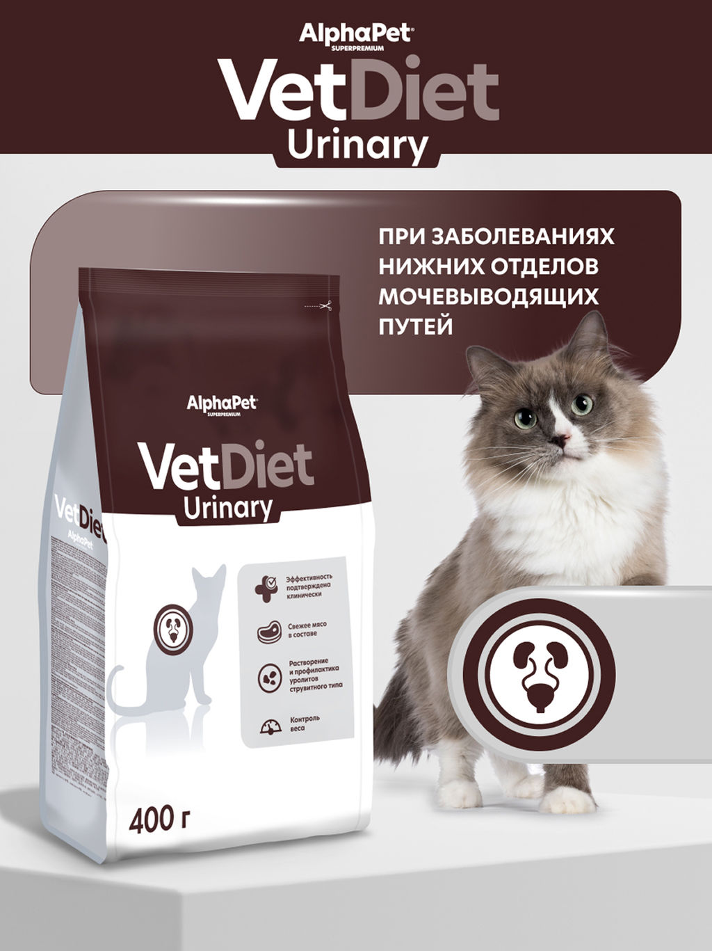 Сухой полнорационный диетический корм AlphaPet Vet Diet для взрослых кошек и котов, рекомендованный при заболеваниях нижних отделов мочевыводящих путей, 0,4 кг 191325