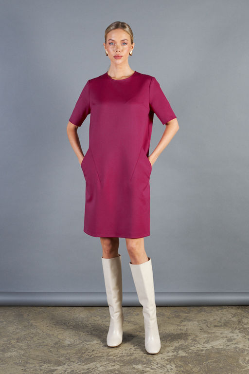 Платье свободного силуэта из плательной ткани. На передней части изделия выполнены декоративные рельефы и карманы. Втачной короткий рукав. Круглый вырез горловины, по среднему шву спинки застёжка на молнию.