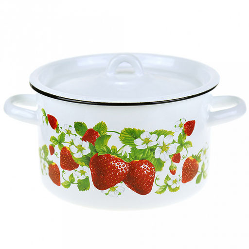 • "Клубничная поляна" Кастрюля эмалированная 2,9л, д20см, h12см, цилиндрическая форма, металлическая крышка, белый (Россия)