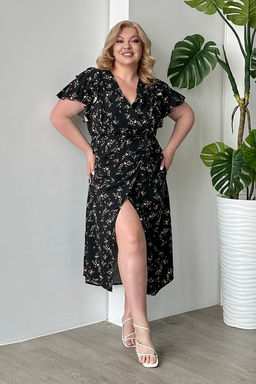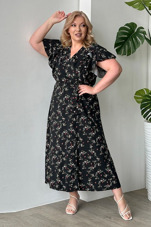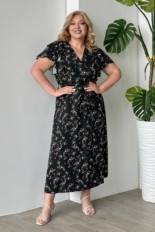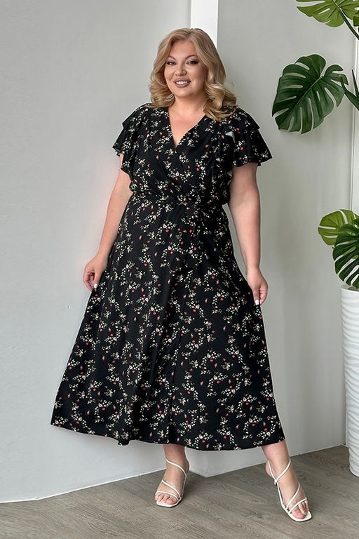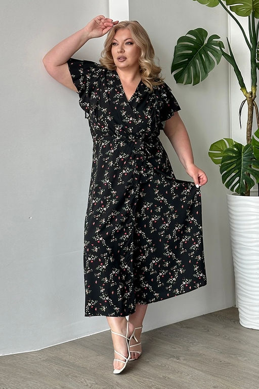 Платье с запАхом с рюшками на рукавах "цветочки" черное