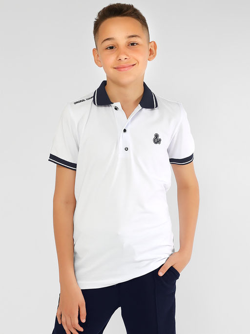 Батник для детей Соль&Перец. Футболка-поло для детей изготовлена из натурального хлопка с добавлением эластана. Классическая модель прямого кроя с коротким рукавом и отложным воротником. Застёгивается на две пуговицы, декорирована вышивкой. Воротник, манжеты, пуговицы и вышивка темно-синего цвета. Самый актуальный, универсальный вариант для школы и отдыха.