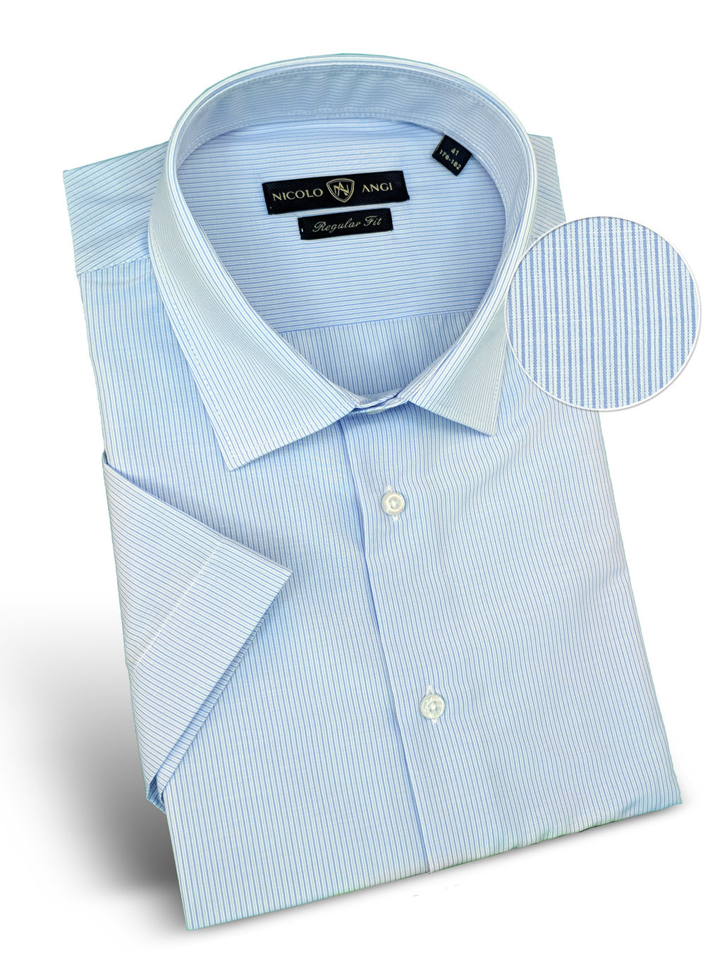 Бренд: Nicolo Angi Длина рукава рубашки: Короткий Карман: 1 карман Силуэт: Полуприталенный силуэт (regular fit) Состав: 80% хлопок, 20% полиэстер Стиль: Деловой Узор (рисунок): В полоску Цвет: Голубой