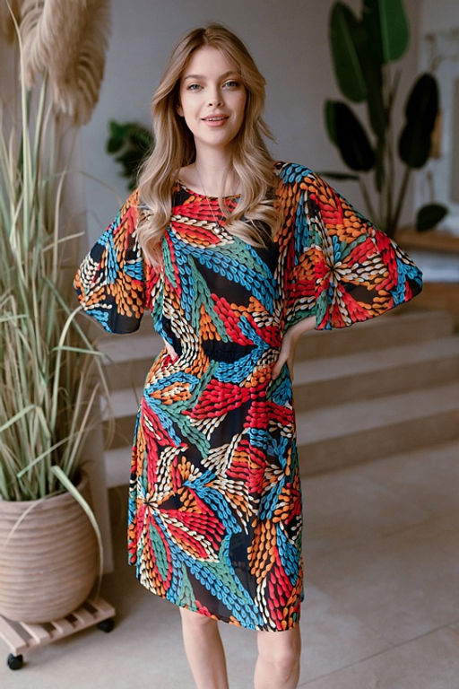 Туника пляжная женская выполнена из эластичной принтованной сетки. Модель приталенного силуэта за счет резинки на талии. Верх туники сделан силуэтом полусолнца, с напуском на груди.­
