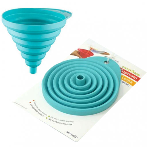 Воронка в быту используется не так уж и часто, но вещь, при этом, совершенно необходимая. Когда возникает потребность перелить жидкость в емкость с узким горлышком или пересыпать мелкозернистые продукты, без воронки просто не обойтись! Поэтому производитель Berossi выпустил уникальную складную емкость диаметром 13 см, которая не только успешно выполняет прямые функции, но и значительно экономит место на кухне. Высота изделия в сложенном виде составляет всего 3 см, поэтому хранить его намного удобнее, чем обычные аналоги.