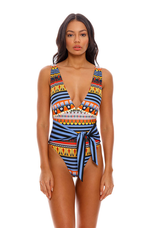 Слитный купальник с V-образным декольте и стильными широкими регулируемыми бретелями на спине. Украшен элегантным поясом в виде банта. Выполнен из люксовой ткани, с тактильным эффектом гладкого и легкого шелка, которая быстро сохнет и сохраняет цвет.­