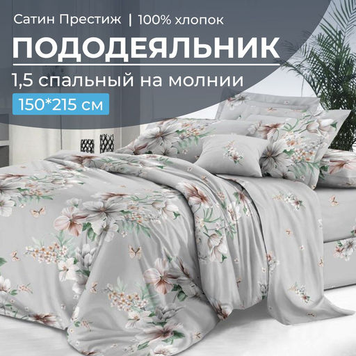 Красивый 1,5 спальный пододеяльник на молнии из сатина «Престиж» размером 150х215, плотностью ткани 115 г/м2. Материал - 100% хлопок, обеспечивающий свежесть и комфортный сон. Сатин «Престиж» имеет очень мягкое и приятное на ощупь плетение. Ткань не подвержена образованию катышков, не электризуется, обладает хорошей воздухопроницаемостью, а также она гипоаллергенна и абсолютно безвредна для здоровья. Поэтому белье из сатина «Престиж» можно застилать детям и беременным. В нашем каталоге вы сможете собрать замечательный комплект постельного белья, исходя из Ваших предпочтений и размеров спальных принадлежностей, а благодаря великолепному качеству ткани и пошива постельное белье прослужит долго и будет радовать Вас и ваших близких. -- Характеристики -- Вес: 740 кг Размерность пододеяльника: 1,5 спальный Размер пододеяльника: 150x215 Замок пододеяльника: На молнии Длина прорези (см): 70 см Ткань: Сатин "Престиж" Состав: 100 % хлопок Плотность: 115 г/м2 Плотность плетения: Высокая Отделка: Без отделки Режим стирки: При 40 градусах Цвет: Серый Расцветка: Краса Вид принта: Цветы Целевая аудитория: Взрослая