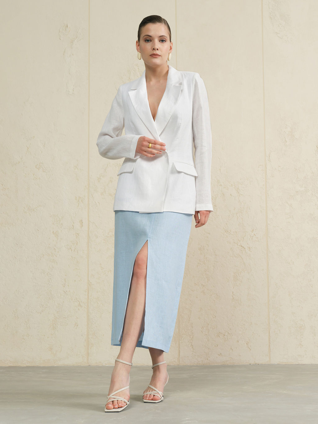 Льняная юбка миди небесно-голубого цвета это стильное и практичное решение для вашего летнего гардероба. Изготовленная из натурального льна, эта юбка подарит вам комфорт и прохладу даже в самые жаркие дни. Актуальный разрез спереди добавляет образу динамичности и женственности, делая вашу походку легкой и уверенной. Небесно-голубой оттенок прекрасно освежает образ, подчеркивая легкость и воздушность стиля. Модель оснащена удобной застежкой на пуговице и карманами, что делает юбку не только красивой, но и функциональной. Свободный крой не стесняет движений, обеспечивая максимальный комфорт в повседневной носке. Эта юбка станет идеальным выбором для прогулок, работы или встреч с друзьями.