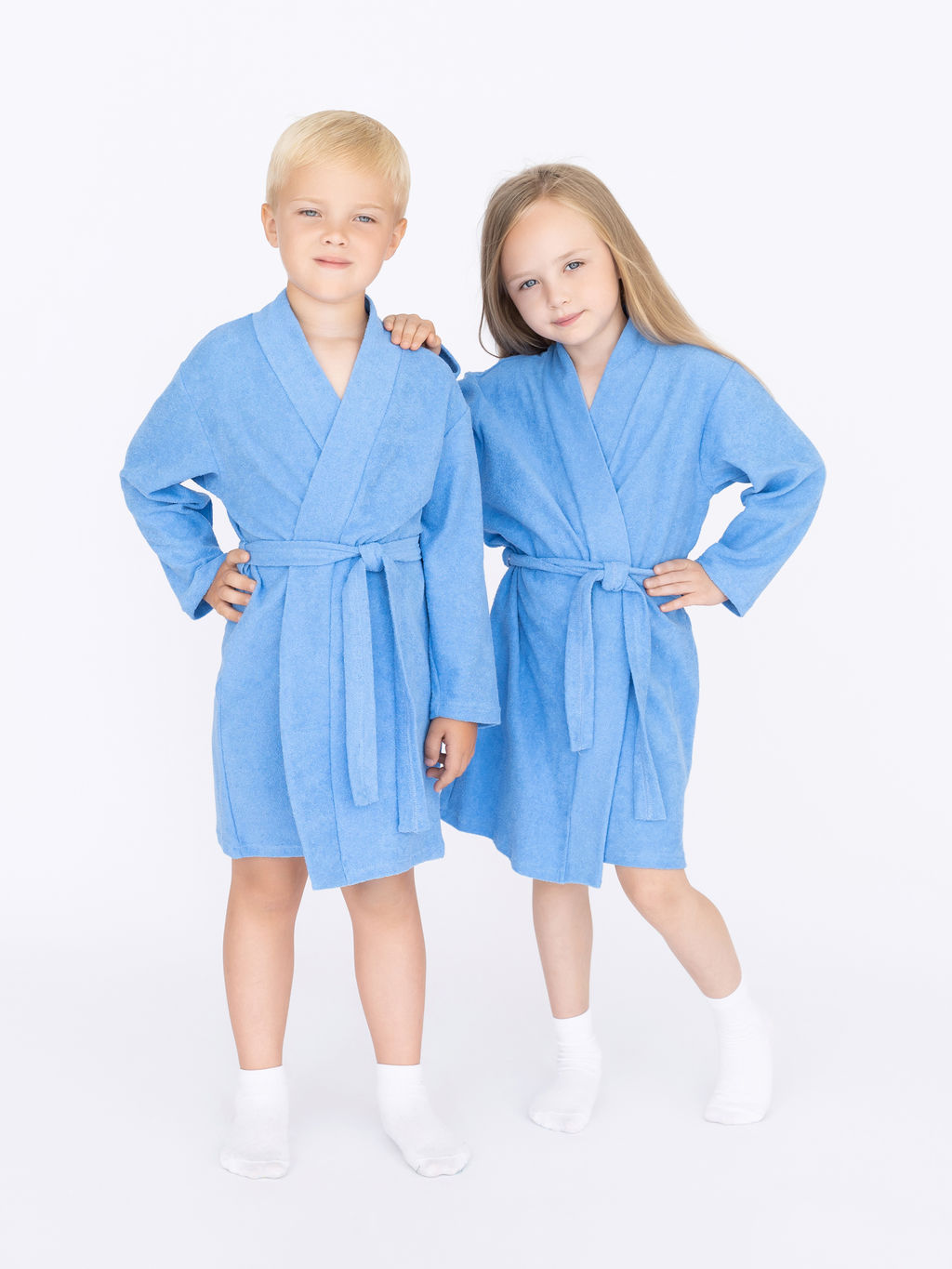 Удобный махровый халат понравиться носить девочке и мальчику после душа или бани. Модель сшита из мягкой, тонкой, хорошо впитывающей воду махры голубого цвета. Халат выполнен с капюшоном, который отлично прикроет голову ребёнка от сквозняка. В боковые петельки вставлен поясок, не позволяющий халатику распахиваться.