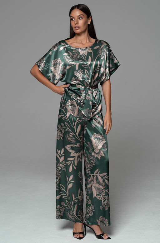 Комплект Mia-Amore состоит принтованного топа свободного силуэта и однотонных широких брюк-палаццо. Комплект выполнен из смесового шелка. Состав:70% натуральный шелк, 25% полиэстер, 5% эластан
