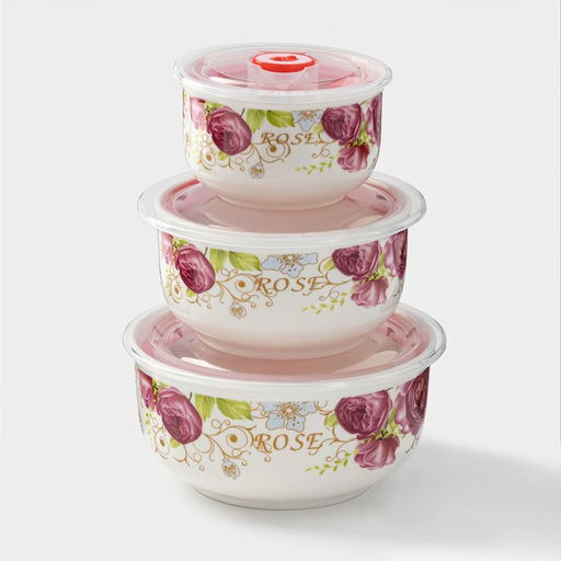 Набор салатников керамических с вакуумными крышками «Розалинда», 3 предмета: 250 мл, 550 мл, 850 мл, d=15,5/12,5/10 см