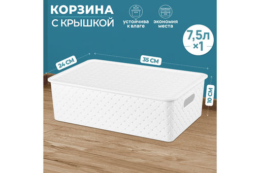 Корзина с крышкой от ELCASA имеет белый цвет. Размер изделия 35х24,5х10,5 см, объём 7,5 литра. Размер дна 32,5х21,5 см. Универсальный дизайн и благородный цвет добавят стиля вашему интерьеру. Органайзер выполнен из полипропилена и станет незаменимым помощником для организации порядка в гардеробной, в комнате или на кухне. Преимущество данного материала над обычным пластиком заключается в его лёгкости и безопасности для здоровья. Используйте пластиковый контейнер для хранения как овощей и фруктов, так и кухонных и хозяйственных принадлежностей. Храните в ней косметику, бытовую химию или моющие средства, расположив в шкафчике или на открытом пространстве. Декоративное плетение с отверстиями обеспечивает циркуляцию воздуха и предотвращает порчу продуктов от недостатка кислорода. Удобные ручки облегчат перенос даже наполненного изделия. Крышка надёжно защитит содержимое от попадания грязи и пыли. Корзину можно использовать для белья, полотенец, одежды и различных мелочей. Поставьте короб под раковину в ванной, возле стиральной машины или на полку. Разместите в детской комнате в качестве ящика для игрушек. Храните в ней садовые инструменты или используйте в гараже, на складе или на балконе под разнообразный инвентарь. Подойдёт для компактной перевозки вещей в багажнике машины. Не рекомендуется применять абразивные моющие средства. В ассортименте бренда ЭЛЬКАСА представлены корзинки разных объёмов, форм и цветов, что позволит собрать уникальный набор, отвечающий вашим потребностям. Создайте систему хранения в едином стиле и эффективно используйте каждый сантиметр пространства!