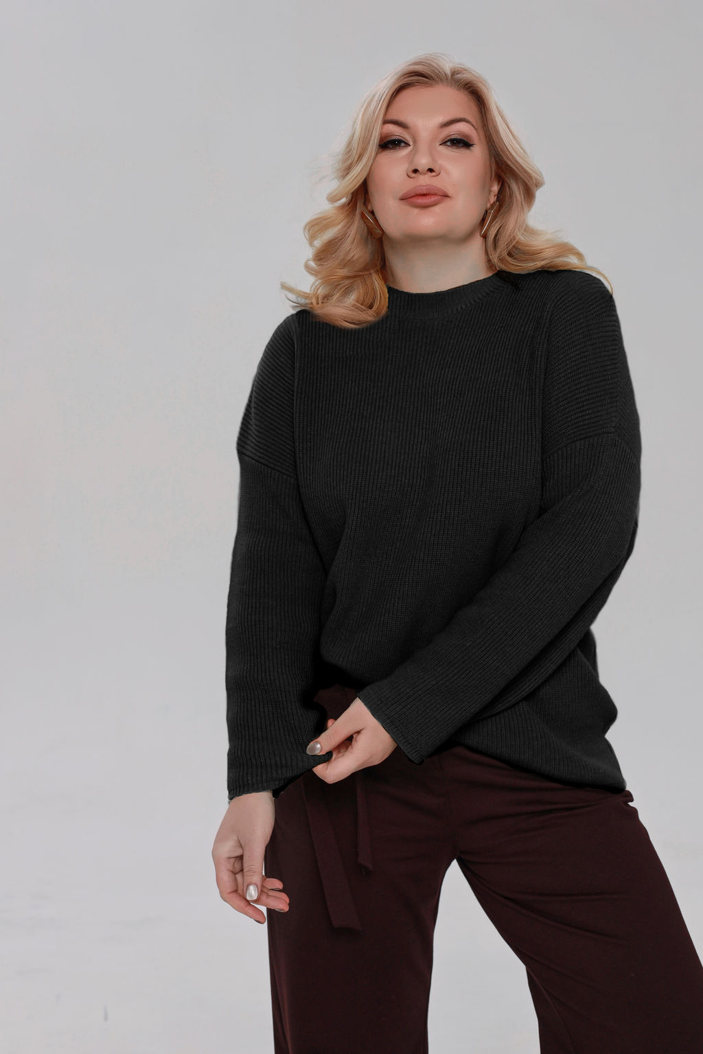 Стильный вязанный свитер свободного кроя выполнена из мягкого трикотажа. Модель имеет круглый вырез и приспущенные рукава полной длины. Фактурная вязка освежает образ и добавляет элегантности. Свободный силуэт искусно обыгрывает фигуру, а мягкий материал обеспечивает максимальный комфорт в течение всего дня. Однотонная классическая модель прослужит не один сезон, сохраняя свой первостепенный идеальный внешний вид. Отлично сочетается с юбками и брюками.­