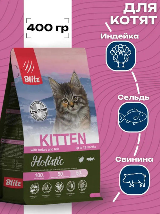 BLITZ Holistic KITTEN TURKEY & FISH низкозерновой корм для КОТЯТ ИНДЕЙКА & РЫБА 0,4 кг