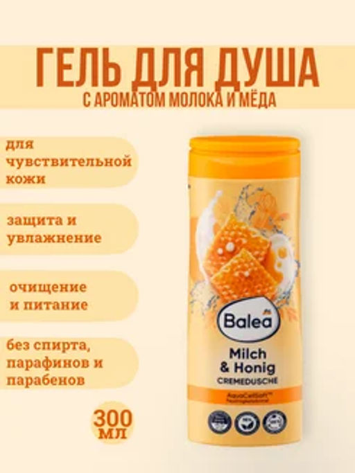 Balea Milch & Honig - крем для душа Молоко и мед, 300 мл образует нежную пену, которая бережно очищает кожу, не пересушивая ее. Его приятный аромат молока и меда оставляет на коже ощущение свежести и комфорта.