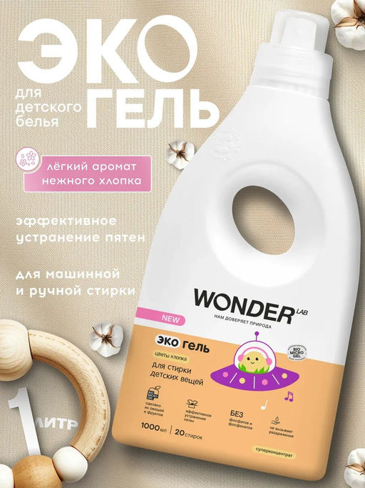 Гель для стирки детских вещей и белья WONDER lab, экологичный гипоаллергенный, с ароматом цветов хлопка, 1000мл