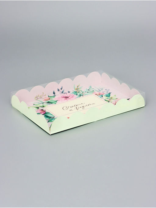 Прочный картон обеспечивает надежную защиту содержимого, а прозрачная крышка позволяет сразу оценить внешний вид угощений без необходимости открывать коробку.