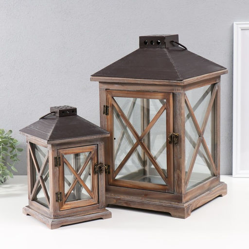 Деревянный подсвечник-фонарь на 1 свечу «Ставни», набор 2 шт., состаренный, 25×25×41 см; 16×16×27 см