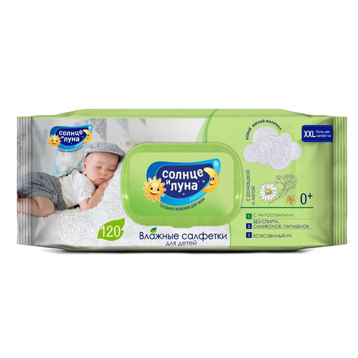 Влажные салфетки детские «СОЛНЦЕ И ЛУНА», с ромашкой и липой, 120 шт.