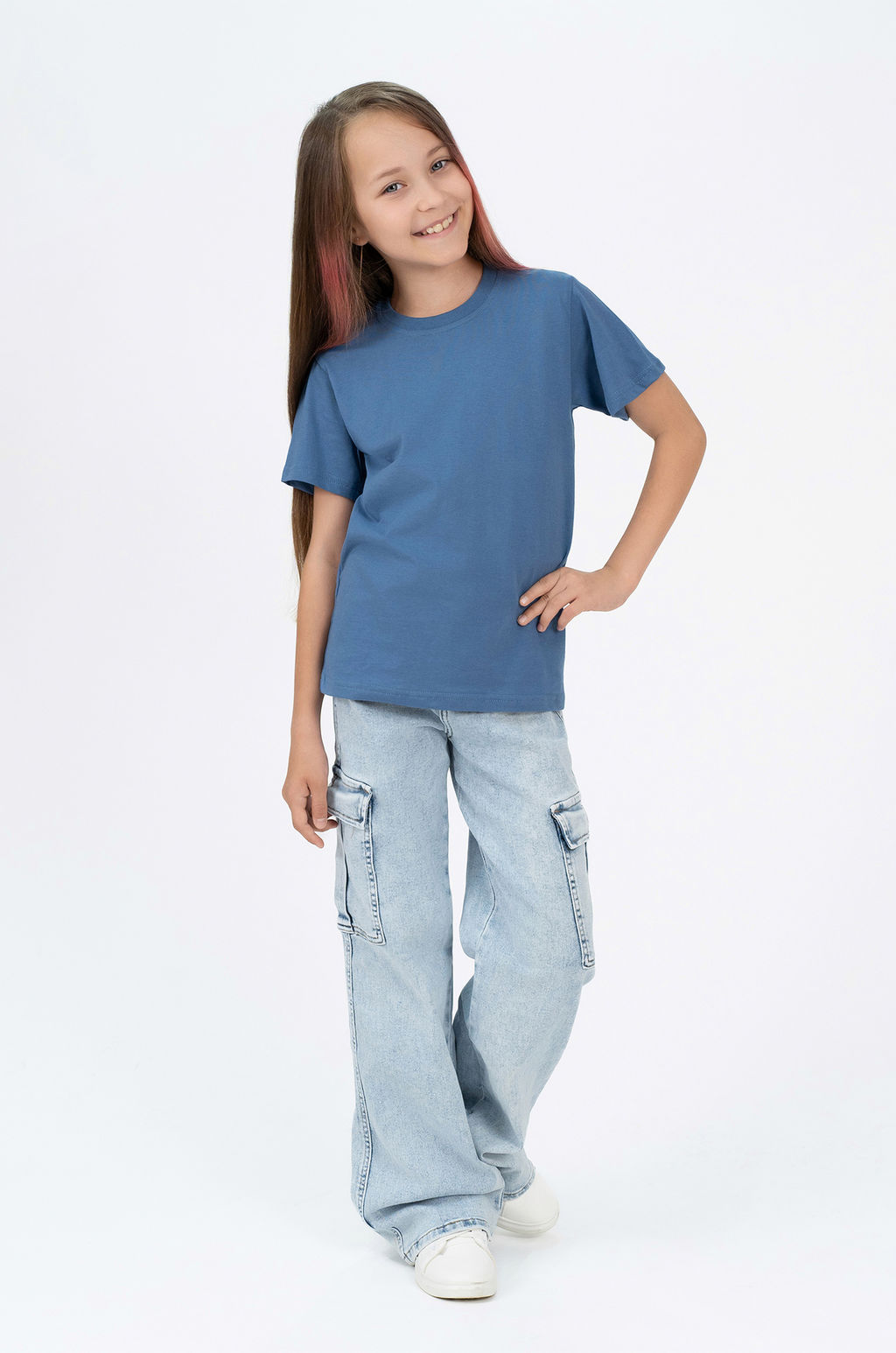 Детская футболка с коротким рукавом для мальчиков и девочек. Приятный и мягкий на ощупь, тонкий и лёгкий трикотаж. Горловина отделана трикотажной бейкой, край рукавов и низ подогнуты и прошиты. Джинсовый (синий) цвет.