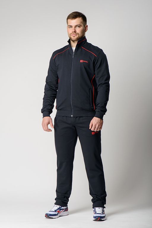 Брюки слегка заужены к низу,боковые карманы на молнии. На задней половине брюк расположен контрастный лампас выше колена, выполненный в тон декоративных кантов толстовки, а фигурный подрез придаёт модели динамичный вид.