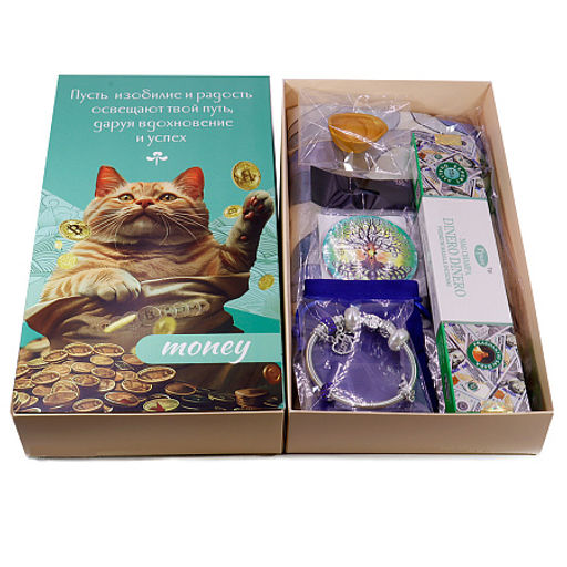 Набор Money подарок, который притягивает богатство и говорит без слов. Забота и процветание, собранные в изящной подарочной коробке: невесомый шарф, изящный браслет в бархатном мешочке, благовоние с тонким ароматом цветов и древесины, красивая подставка для благовоний, превращающая возжигание в маленькую медитацию; миниатюрная денежная раковина фен шуй и главный символ набора денежный котик на подарочной коробке, который бесконечно машет лапкой, привлекая в дом финансовый поток и материальное благополучие.
