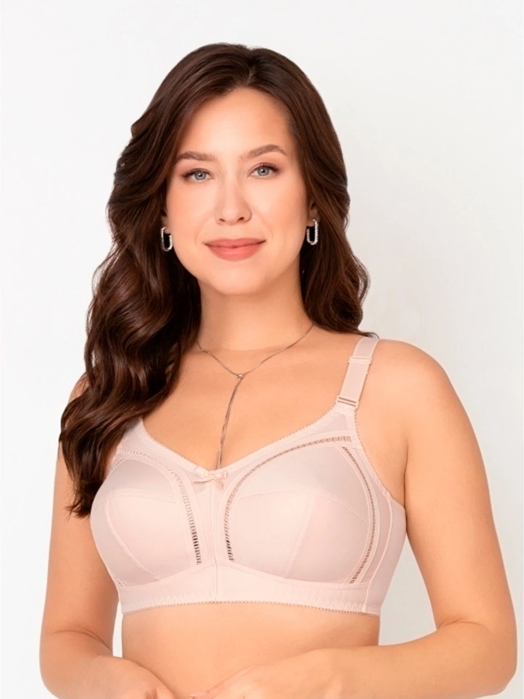 Закрытый бюстгальтер телесного цвета, без косточек для большой груди. Закрытая чашки, T-образный шов, широкий стан и широкие бретели комфортно поддерживают большую грудь. Внутренняя деталь чашек на хлопковом подкладе. Классический закрытый бюстгальтер с мягкими чашками без каркасов на каждый день.