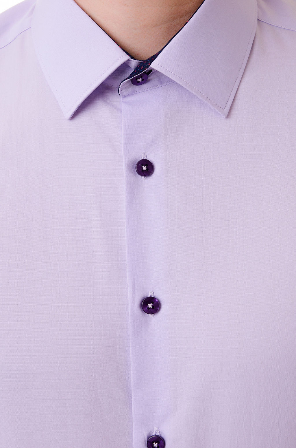 Рубашка классического прямого кроя сиреневого цвета с длинным рукавом. Внутренний воротник, стойка и внутренние манжеты выполнены из дополнительной ткани.