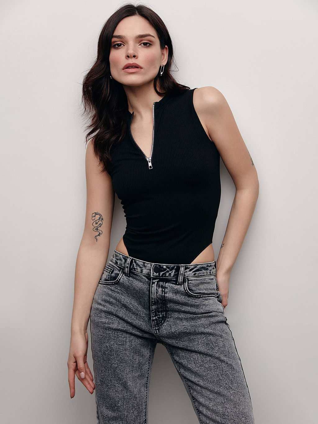 Боди в рубчик с воротником-стойкой на молнии займет важное место в повседневном гардеробе девушки. Модель отлично сочетается с брюками, юбками и денимом.