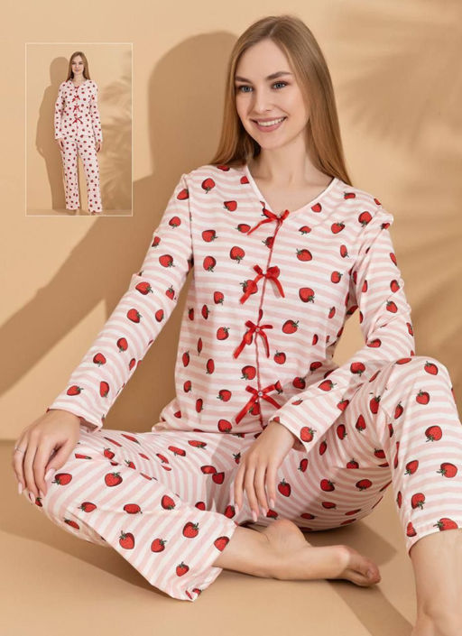 Женская пижама из хлопка и эластана представляет собой комфортный комплект для сна, состоящий из двух предметов одежды: удобной кофты и мягких штанов. Основные характеристики и особенности такой пижамы включают:? Материалы- Хлопок: обеспечивает мягкость, легкость и воздухопроницаемость материала, способствуя комфортному отдыху и поддерживая оптимальные условия для кожи.- Эластан: добавляет тканям эластичность, позволяя изделию сохранять свою форму даже после многократных стирок и повседневного использования.? Кофта:- Прямой классический крой обеспечивает свободу движений и комфорт в течение всей ночи.- Круглый ворот создает стильный и элегантный вид, подчеркивая шею и линию декольте.- Украшение бантиками придает изделию особую привлекательность и делает его идеальным выбором для женщин, ценящих женственность и красоту.? Штаны:- Штаны на резинке обеспечивают удобство и поддерживают оптимальный уровень комфорта.- Прямой крой позволяет легко двигаться и предотвращает дискомфорт, связанный с ограничением свободы движения.Таким образом, эта пижама сочетает в себе практичность, комфорт и эстетику, делая её отличным выбором для тех, кто хочет чувствовать себя уверенно и расслабленно перед сном. 92% хлопок 8% эластан
