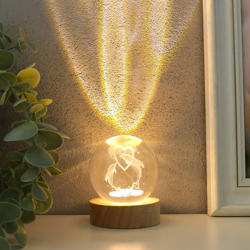 • Световая фигурка стекло Шар. Голограмма: Два дельфина, d=6 см, подставка дерево, USB, 6.5?6.5?7.5 см