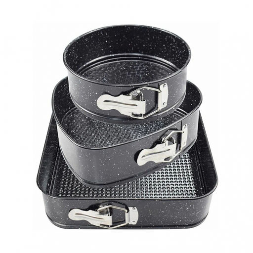 Форма для выпечки разъемная набор с 2-х слойным антипригарным покрытием изнутри и снаружи - подходит для использования в духовых шкафах. Разъемный замок, съемное дно, углеродистая сталь, внутреннее и внешнее каменное покрытие Granite. Формы для выпечки изготовлены из углеродистой стали. Этот материал быстро нагревается, равномерно распределяет тепло, безопасен для здоровья. В такой форме с антипригарным покрытием тесто не прилипает ко дну и стенкам во время запекания и не пригорает, готовый пирог легко отделяется.