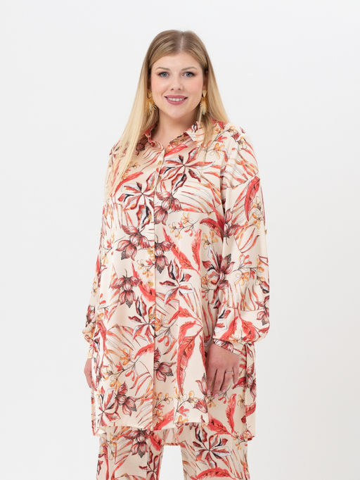 Эта эффектная, удлиненная блузка в пижамном стиле выполнена из шелковистой ткани с причудливым рисунком, который можно рассматривать не отрываясь. Модель прямого силуэта, с длинным втачным рукавом, с притачной манжетой. Объем манжеты регулируется за счет парных пуговиц. Воротник рубашечный, на стойке, застежка на пуговицы. Особый шарм изделию придают высокие разрезы по бокам. Внутри рукава настрочена пата, с помощью, которой можно зафиксировать рукав, слегка присобрав его. Блуза отлично комплектуется с широкими брюками. Это идеальный выбор для создания элегантного образа, который привлекает внимание и вызывает сильные эмоции.
