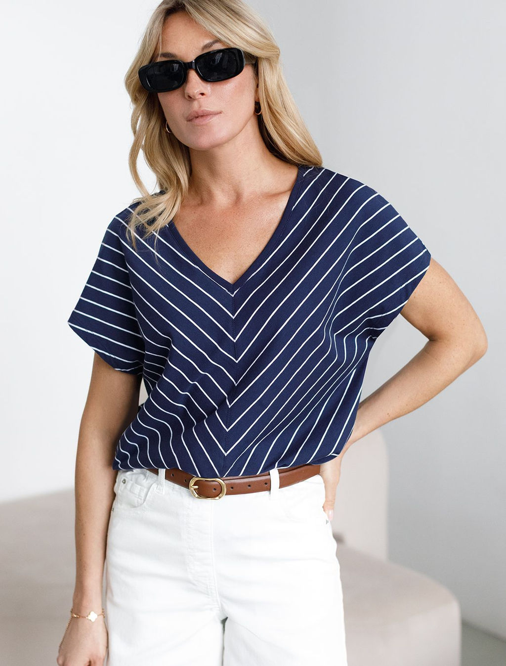 • Футболка в полоску с V-вырезом и цельнокроеным рукавом из гладкого хлопка