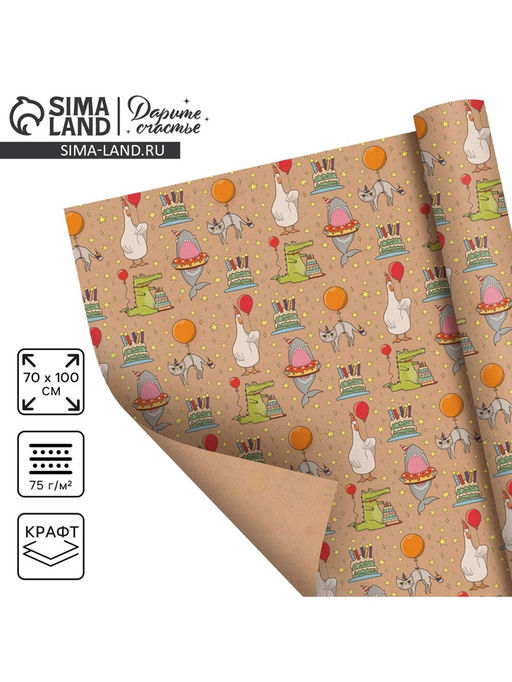 Цена за 3 шт. Бумага упаковочная крафт «Праздничные животные», 1 лист, 70×100 см