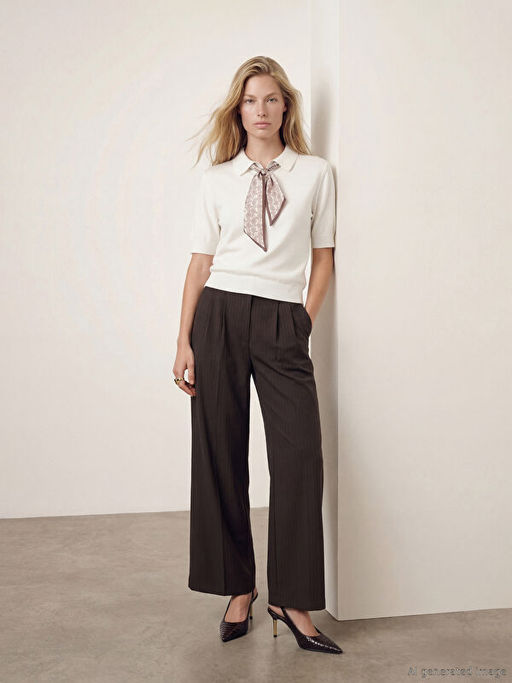 Y?ksek Bel Geni? Pa?a Pileli Kad?n Kuma? Pantolon