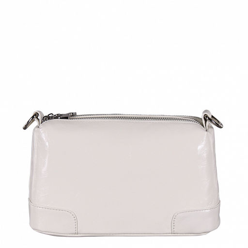 Сумка кросс-боди, выполнена из натуральной лаковой кожи. Декорирована брелоком цепочкой. Дополнена серебристой фурнитурой. Данная модель закрывается на молнии. Каркас полужесткий. Носится на плече за съемный ремень с регулировкой длины.