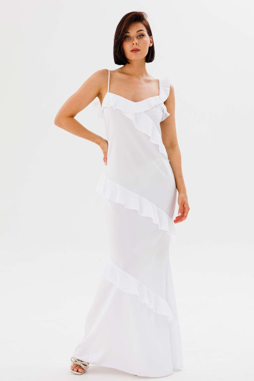 Платье выполнено из шелка армани, по платью обработаны воланы, одна бретель тонкая, другая обрабоатна воланом. Застежка - потайная молния по центральному шву спинки­