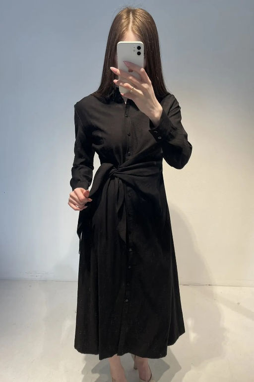 Платье из вискозной ткани с крэш-эффектом приталенного силуэта с застежкой на пуговицы. Изделие отрезное по линии талии, с мягкой драпировкой, переходящей в пояс. Вырез горловины обработан отложным воротником на стойке. Втачной длинный рукав с манжетой, застегивающейся на пуговицы.