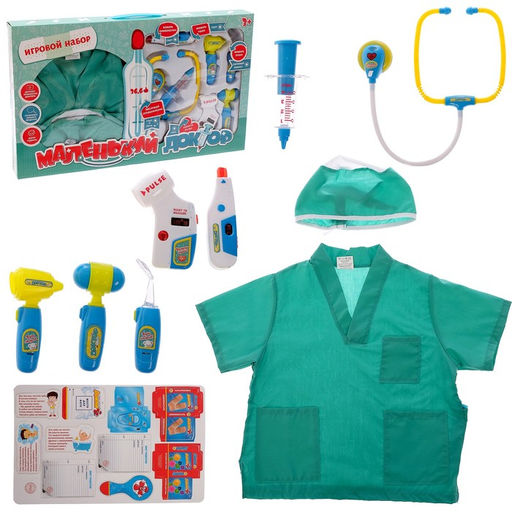 Описание товара Маленькому медику необходимы свои инструменты. С набором доктора № 4 «Лучший врач» у малыша будет всё необходимое, чтобы лечить кукол и плюшевых зверей. Разнообразные предметы сделают знакомство с профессией врача увлекательным, а яркие эффекты добавят игре реалистичности.Стетоскоп издаёт звук сердцебиения и светится, а остальные приборы имеют световые эффекты: пульсометр (для измерения биения сердца), зеркальце (для осмотра рта и зубов), термометр, отоскоп (для осмотра ушей), молоточек (для проверки реакции ручек и ножек).Ребёнок с удовольствием наденет медицинский халат и шапочку, будет делать перевязки, ставить уколы, измерять температуру у игрушек, производить осмотр — совсем как настоящий терапевт!Развиваемся играяПредставив себя доктором, чадо освоит социальные роли, получит новые знания о важных профессиях, станет внимательнее и заботливее. Такая игра не только пробудит фантазию юного специалиста, но и поспособствуют развитию эмоционального восприятия, мелкой моторики и воображения.ОсобенностиВсе элементы набора изготовлены из высококачественных материалов, безопасных для детского здоровья. В комплект входят батарейки типа LR44 (V13GA, AG13, LR1154).Набор предназначен для ребёнка 3–4 лет. Чепчик подходит на окружность головы 50 см, его высота — 11,5 см. Ширина халата в плечах — 31 см; расстояние в талии от шва до шва — 38 см; от плеча до подола — 44 см. Возраст: От 3 лет. Вид упаковки: Коробка. Тематика праздника: 8 Марта. Звук: Да. Работает от батареек: Да. Свет: Да. Типоразмер батареек: LR44 (V13GA, AG13, LR1154). Вид: Набор. Вид: Терапевт. Наша разработка: Да. Размеры товара: 33.2/5.5/55.