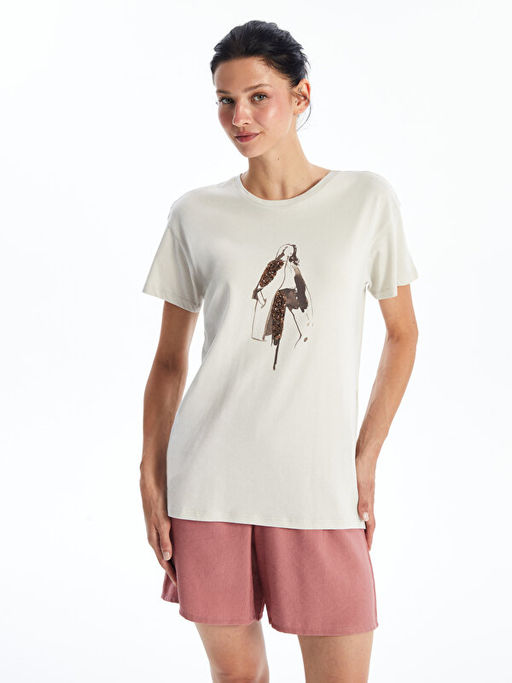 Bisiklet Yaka Bask?l? K?sa Kollu Kad?n Ti??rt