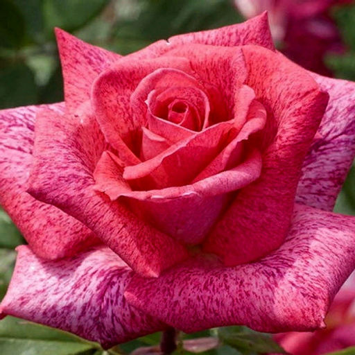 Чайно-гибридная. Куст формируется весьма компактным, его высота составляет в среднем 80-90см, а ширина кроны не превышает 50см. Листья среднего размера, небольшие, имеют темно-зеленый окрас. А также на листе присутствует небольшая глянцевость, которая заметна при попадании солнечных лучей на листву. Бутоны розы отличаются насыщенным и ярким цветом. У самой розетки лепестки имеют темно-розовый насыщенный оттенок, а ближе к краю проявляется малиновый подтон со звездной пылью. Благодаря этой небольшой пыли цветок становится пёстрым, но при этом не имеет двухцветность. По форме розетка бокаловидная, а сам цветок чашевидный с высоким центром. Размер бутона крупный, его диаметр составляет 10-12см. По типу цветок относится к среднемахровым сортам и имеет 30-35 лепестков. На одном стебле формируется только 1 цветок, поэтому тип соцветия у розы одноцветковой. Аромат - очень сильный и стойкий. Некоторые говорят, что он похож на майскую розу с очень тонким и насыщенным запахом.