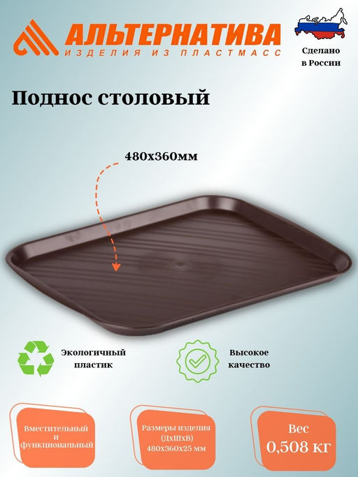 Прямоугольный поднос изготовлен из высококачественного пластика. Изделие оснащено широкими бортиками имитирующими ручки, благодаря которым его удобно переносить. Изделие можно использовать как в быту, так и на предприятиях общественного питания (столовые, кафе, рестораны и т.д.). Вместительный и функциональный поднос станет незаменимым аксессуаром, как для сервировки, так и для декора кухни. Размеры изделия (ДхШхВ) 480х360х25 мм.­